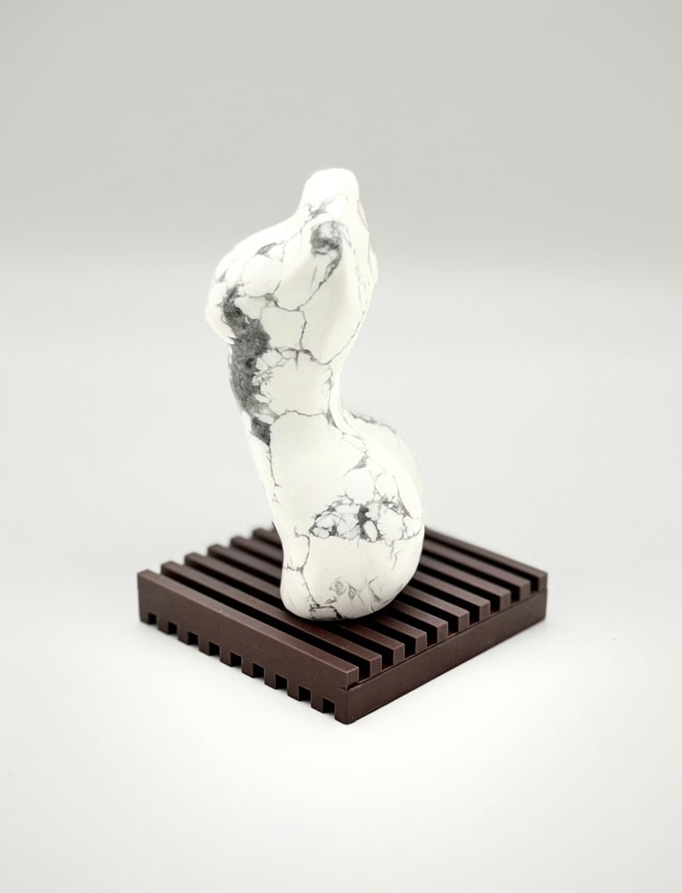 A study in stillness and strength. This sculpted torso is carved from natural howlite, a stone known for its soothing energy, clarity, and connection to higher consciousness. With soft curves and marbled veining, it serves as both a visual meditation and a symbol of grounded femininity. Place it on your altar, your desk, or in your crystal collection as a reminder to breathe, soften, and remain rooted.